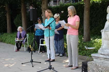Aufgrund des schönen Sommerwetters befanden sich zahlreiche Menschen im Hofgarten, einige zum Entspannen, auch manche Touristen, die sich den romantischen Park genauer anschauen wollten, und natürlich auch Interessierte, die wegen unserer Veranstaltung gekommen waren.