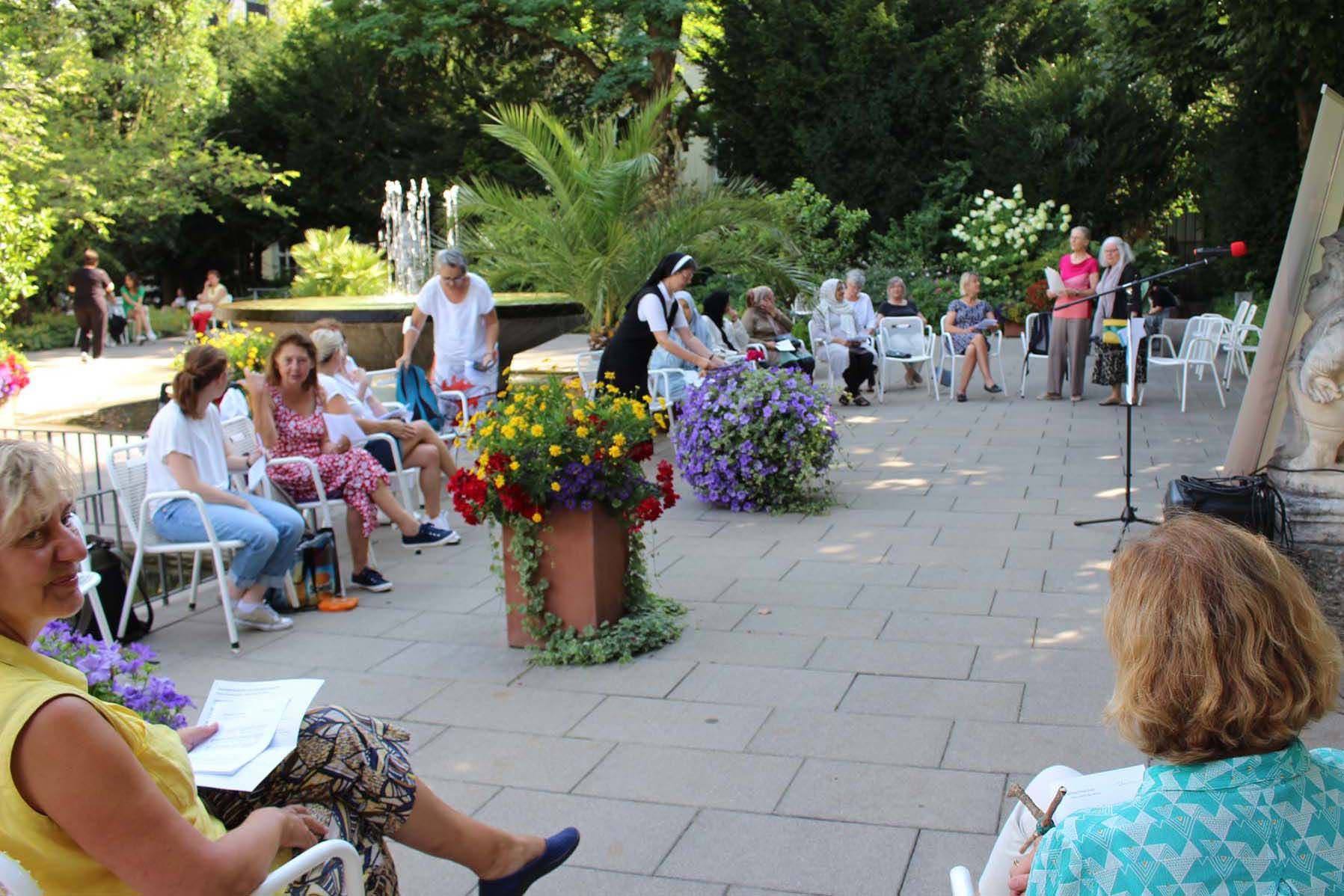 Sr. Theresia lud anschließend alle zu einer Schweigeminute ein, um in der Tradition von Religions for Peace für den Frieden der unvorstellbar großen Zahl von gewaltsam getöteten Menschen zu gedenken: in der Ukraine, in Syrien, im Jemen und in allen Kriegsgebieten auf der Erde, aber auch der Menschen, die wegen der globalen Krise vom Hungertod bedroht sind .
